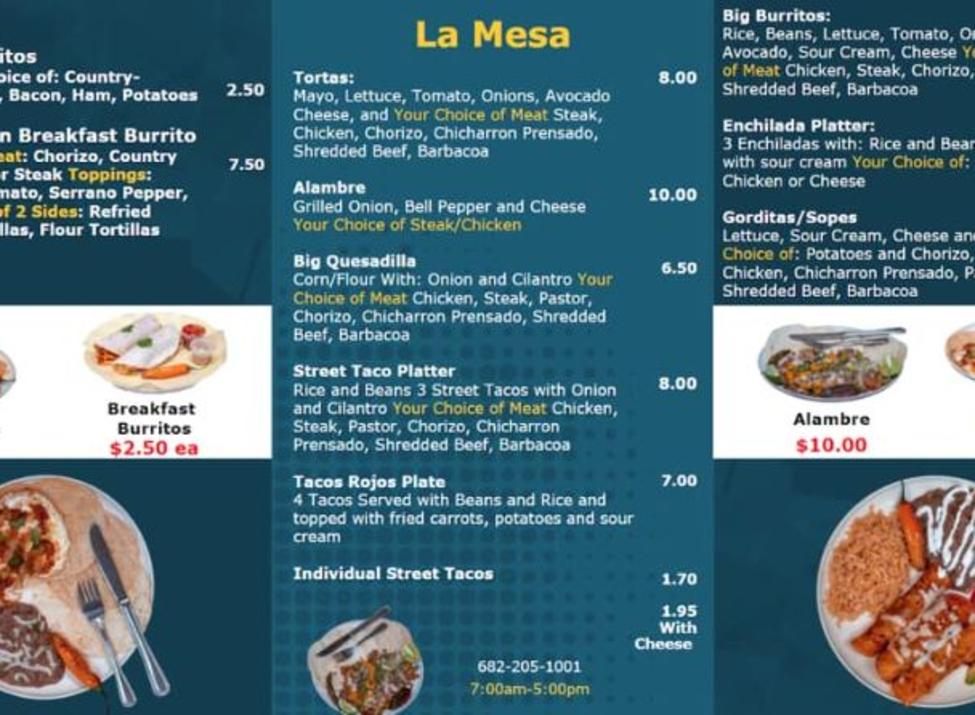 At La Mesa we pride ourselves in the ability not only to deliver food and drinks of high quality but at fair and affordable prices. 6194664470 Tuesday - Sunday. Tacos de la mesa.
